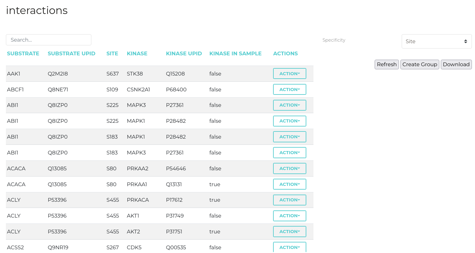 Substrate-kinase relationships can be viewed in a tabular format on the 'Interaction Details' page. Here, clicking cells corresponding to either substrates or kinases will open a window that protein functional information and external links drawn from UniProt. Each substrate-kinase relationship has a dedicated page summarising additional evidence for this interaction which can be accessed by cliking the 'Investigate' button.