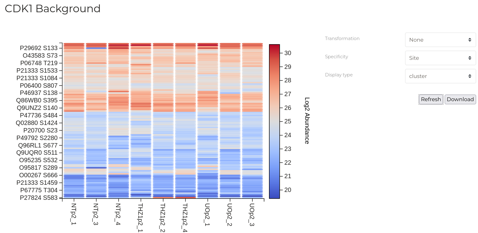 Cluster maps are particularly useful for visualising patterns of phosphorylation site abundance changes between samples and treatment groups. Here, hierarchical clustering is performed to create groups of phosphorylation sites that share similar patterns of abundance changes. A range of plot control options are provided at right which can be used to customise the data, analysis and display settings. After editing these parapeters, click 'Update' to visualise the result.